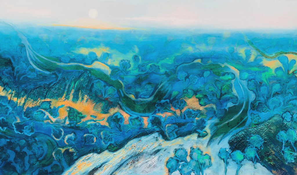Coming to Australia from Asia over five decades ago, Dahl has absorbed the landscape into her psychic. She has familiarized herself with the desert country with its many moods and complex physical and spiritual nuances. The memories of the Land of her birth – Thailand,with its exotic smells, bustle, colour and fragrant blooms, also feeds into her work.