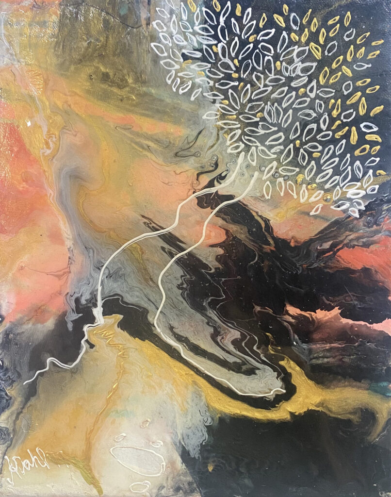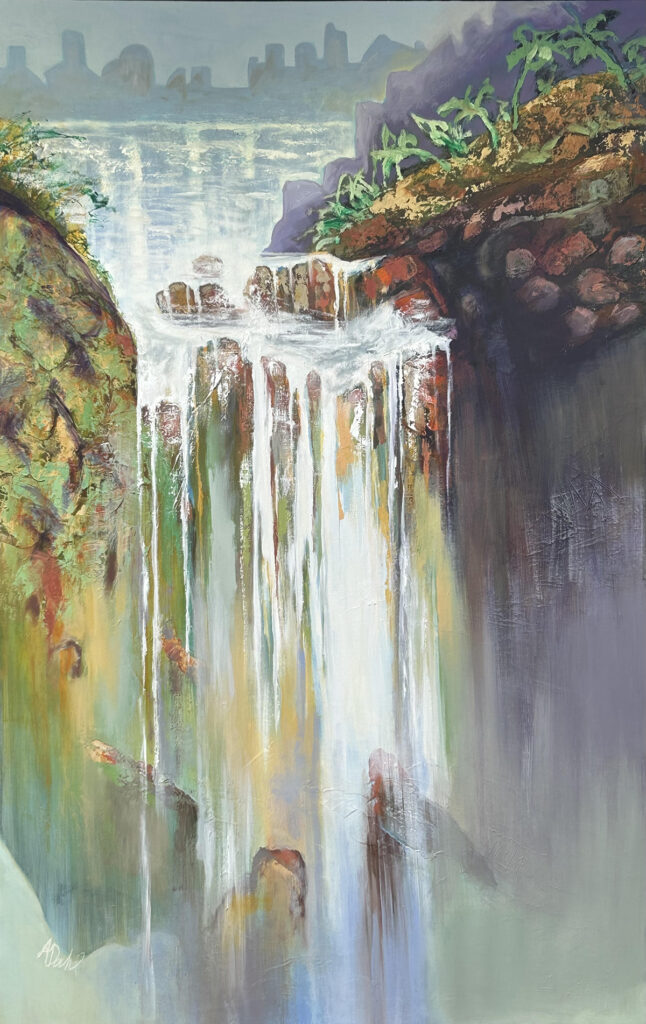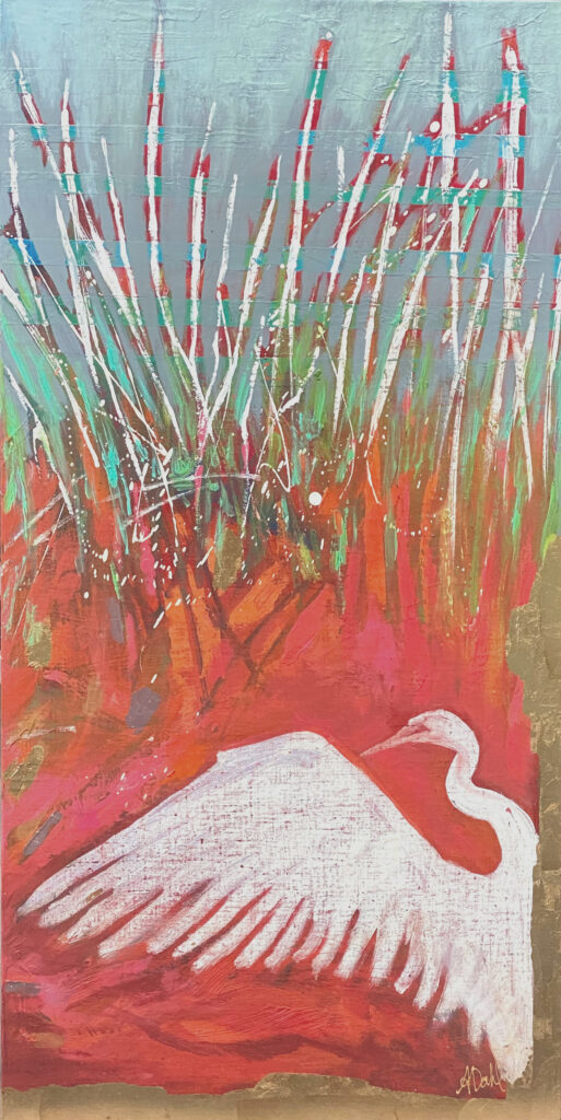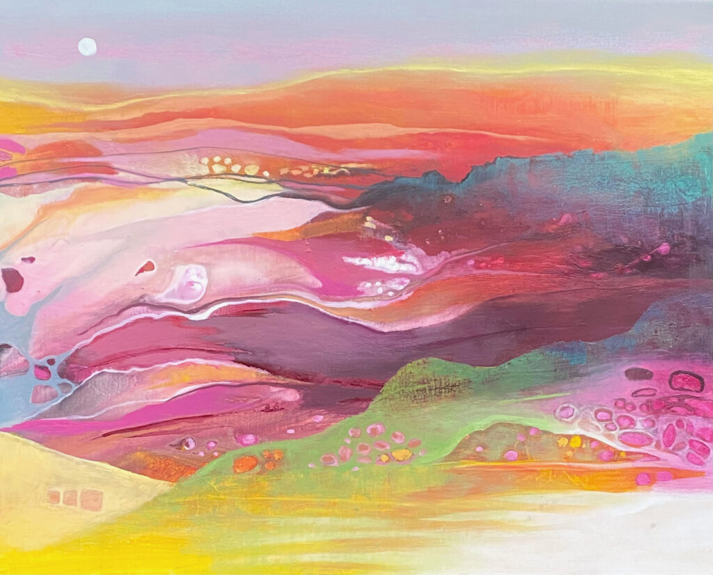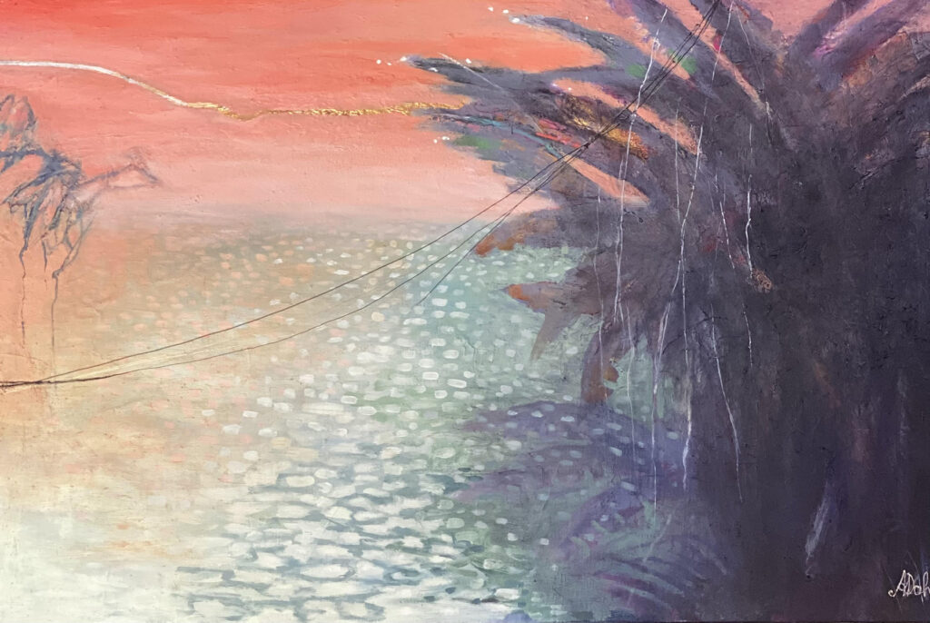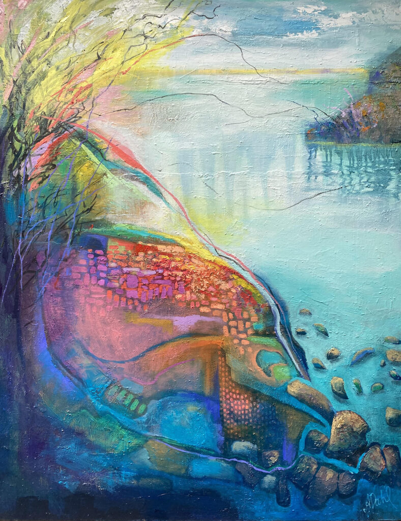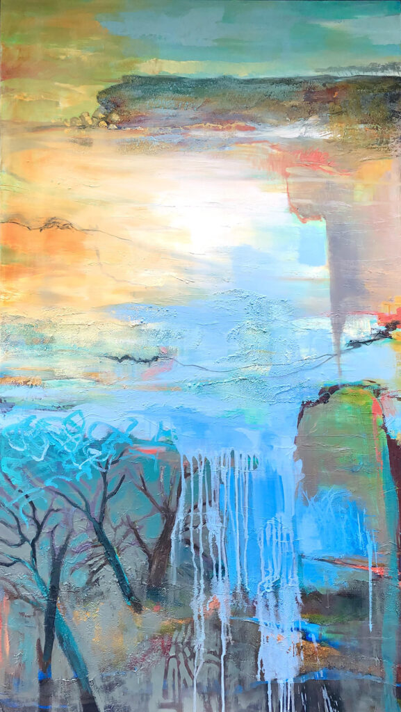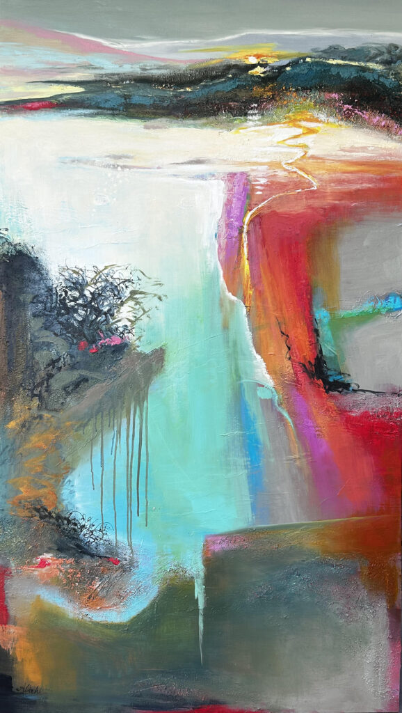 The materials that Astrid uses, varies with each painting as she straddles abstractness and recognizable forms. Acrylics are sometimes combined with oils along with a variety of textured grounds and mediums. Her paintings are on canvas, stretched on a stretcher frame then varnished with a satin finish.