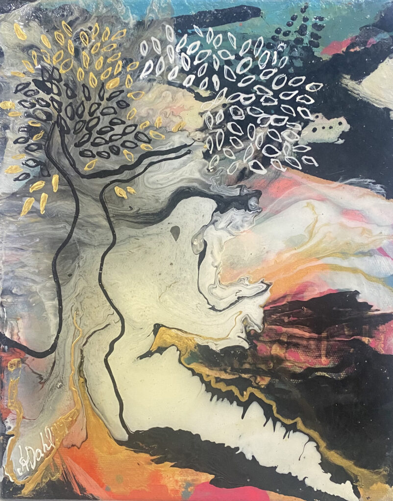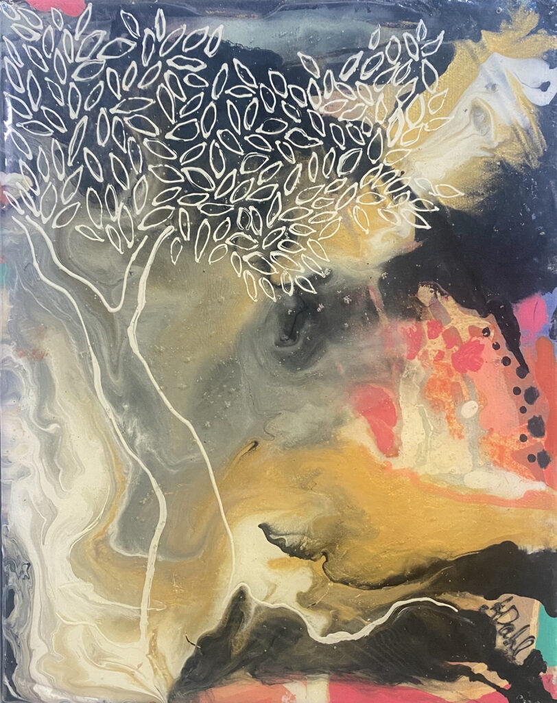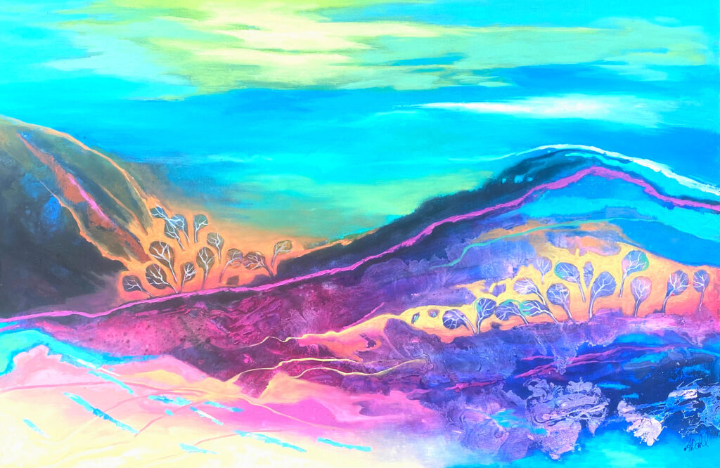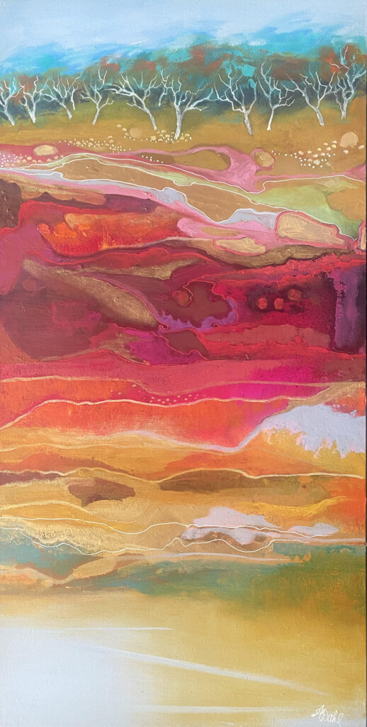 Dahl’s work has luminosity and character as it captures the deep spiritual nature of “land” and growth, with its patterns, lines and shapes emphasized by colour.