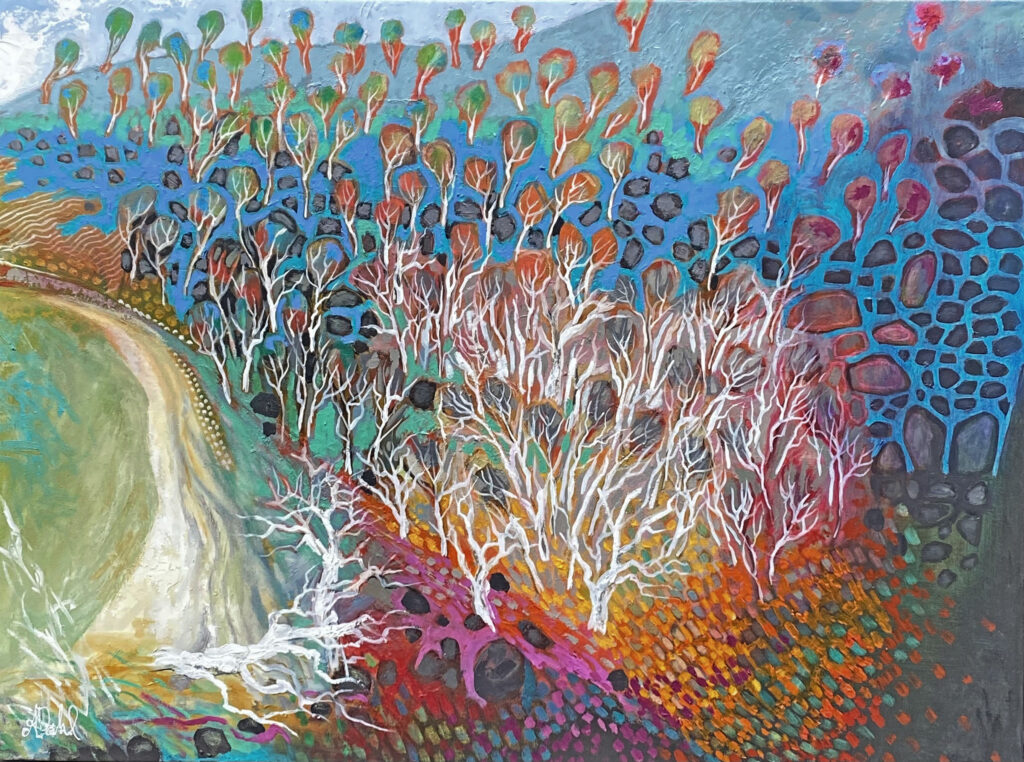 She has begun to see and hear a subliminal visual text. Soft whisperings, low murmurings past and present with half told stories entwine and colide. These observations are symbolized by the textures, patterns and markings that pepper her textured earth and organic growth paintings.